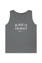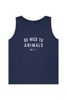 This gender-neutral unisex tank is a perfect fusion of style and advocacy. The minimalist design centers on the powerful message ‘BE NICE TO ANIMALS,’ boldly displayed in all caps across the front in distressed white lettering. The Mercy For Animals logo beneath this impactful statement is a subtle nod to the organization’s work to promote kindness. Available in a variety of vibrant colors, this tank is a versatile addition to any wardrobe.