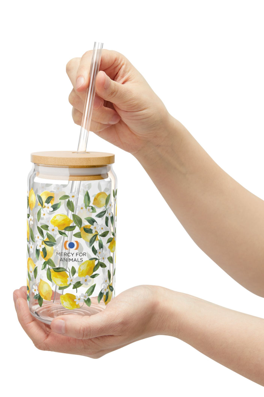 Mercy For Animals’ 16-ounce, lidded can-shaped sipping tumbler is the ideal way to celebrate kind summer vibes! The plastic straw and bamboo lid will keep everything out of your tasty beverage. This durable, lead-free, grip-friendly glass tumbler will delight everyone with its charming design. Whether you’re drinking your favorite summer cocktails, refreshing sodas, vegan iced coffees, or mocktails, this tumbler is a great way to show off your support for farmed animals at any get-together. It also makes the perfect gift for any occasion!
