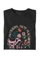 Introducing our oversize T-shirt, designed for those who want to make a bold statement for animals and kindness to cows. This T-shirt features a powerful graphic of a mother cow and her calf, with delicate flowers and the slogan ‘Mothers, Not Machines’ proudly displayed above. The design is a reminder that cows are living beings, not milk-production machines. It also highlights the emotional bond between cows and their calves, which is cruelly broken in the dairy industry so that the milk can be collected and sold for human use. This T-shirt is an easy way to draw awareness to this issue and other harsh realities of the dairy industry while helping build a world where animals are treated with respect and compassion.