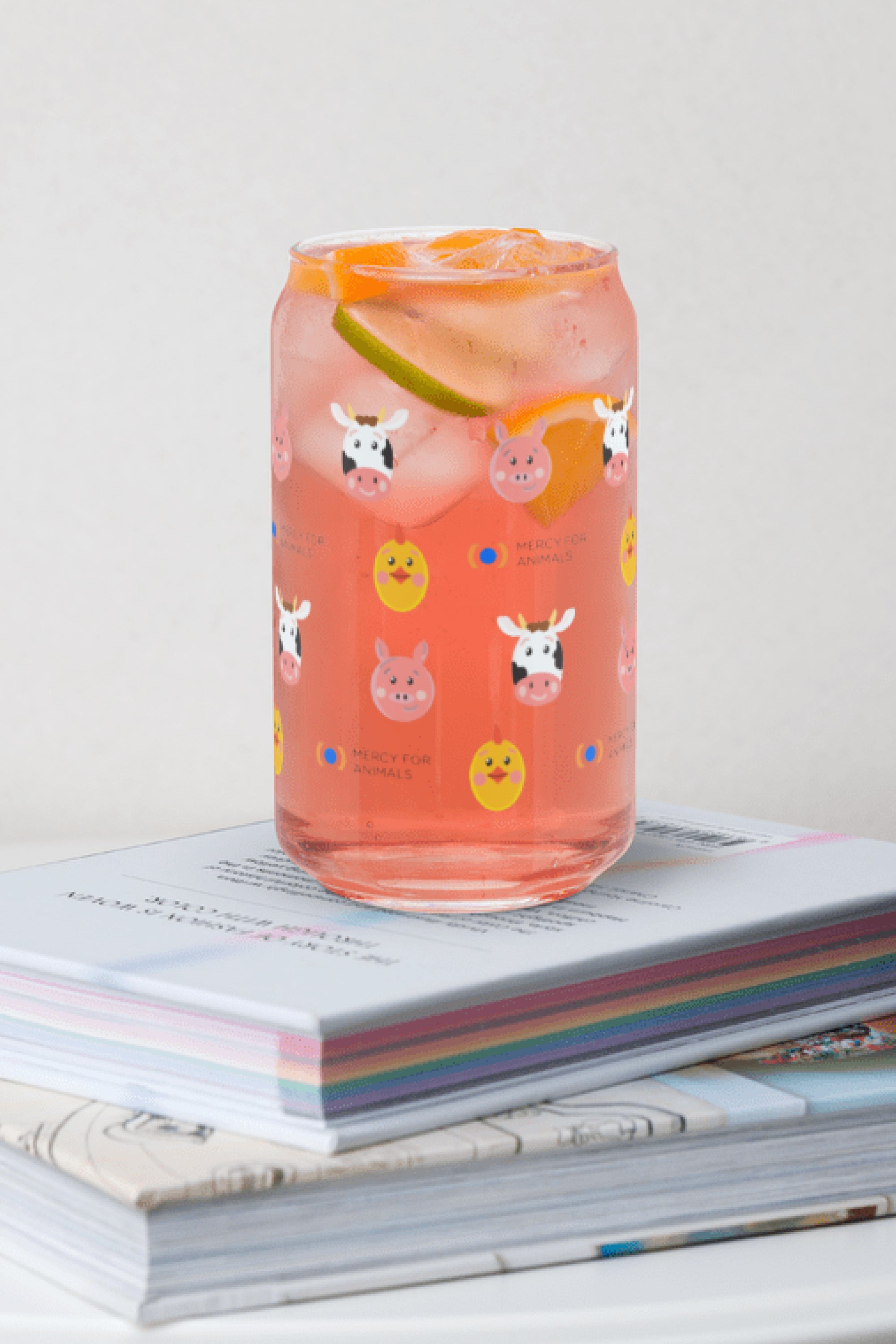 Take your compassion up a notch with Mercy For Animals’ can-shaped tumbler. This 16-ounce glass is sure to quench your thirst while gently reminding the world to love all animals. Whether you’re drinking refreshing sodas, vegan iced coffees, cocktails, or mocktails, this glass is a great way to show off your support at any get-together. It also makes the perfect gift for any occasion!