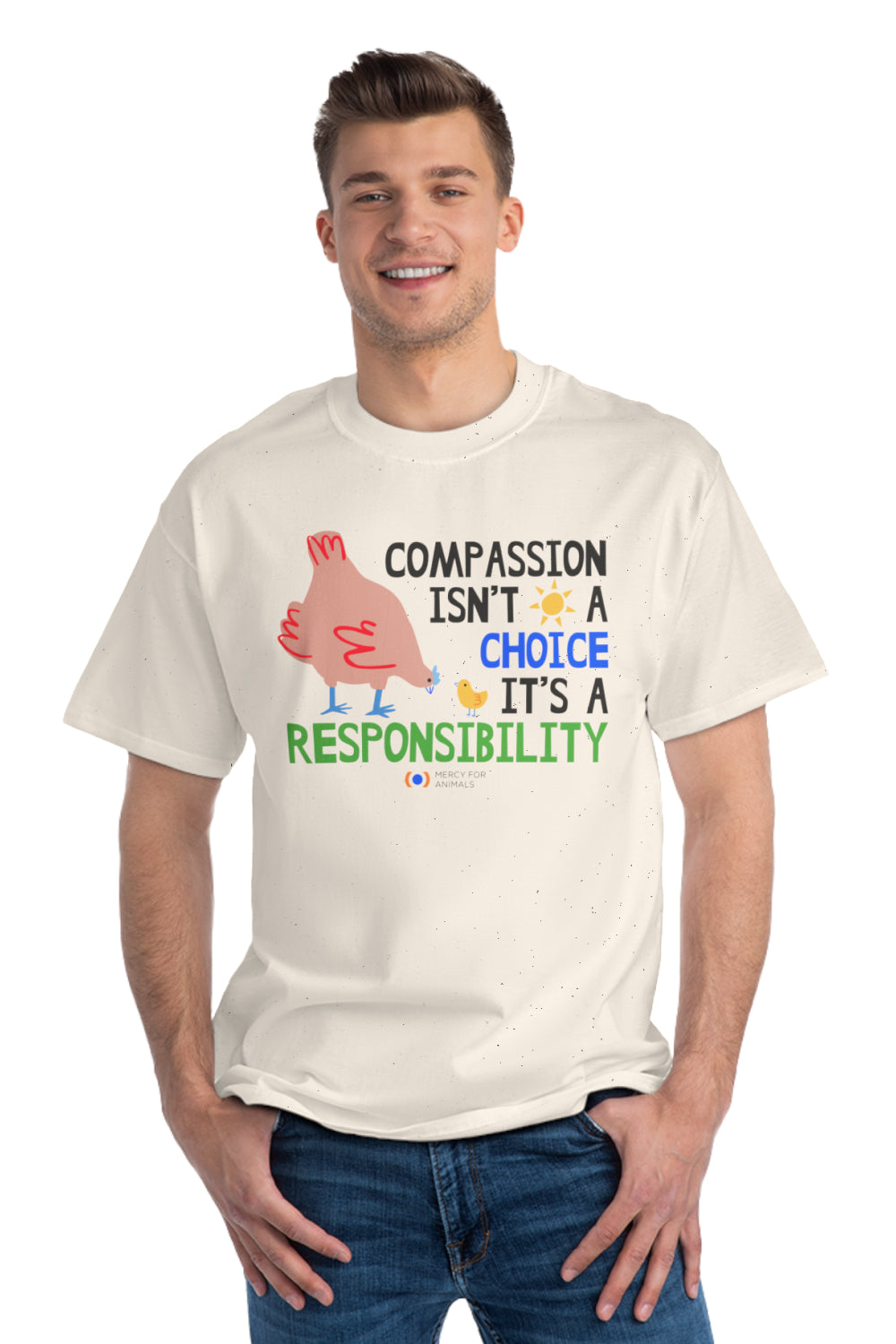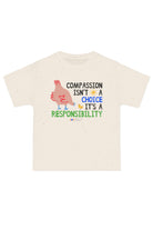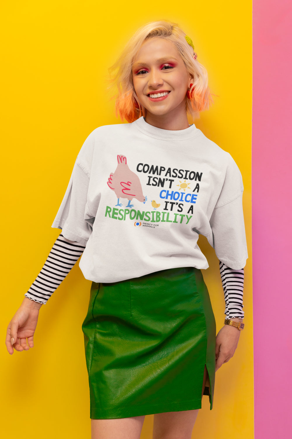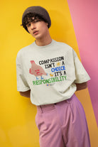 Embrace the power of kindness with this oversize T-shirt featuring an inspiring message: ‘Compassion isn’t a choice. It’s a responsibility.’ The design is enhanced with a sweet illustration of a hen and her chick, creating a serene and thoughtful animal-friendly aesthetic. Crafted for comfort and style, this T-shirt offers a relaxed, boxy fit that’s perfect for easy layering. The dropped shoulders provide a modern, laid-back vibe, while the wide-neck ribbing adds a touch of contemporary flair.