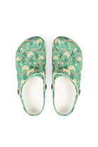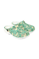 The Mercy For Animals ‘City Graffiti’ clogs boast an energetic and edgy design with bold colors and lively imagery that make a striking statement about compassion. With a vibrant cow and chicken set against a deep navy background, the design features dynamic splashes of yellow, pink, and blue complemented by graffiti-style phrases like ‘Animal Liberation,’ ‘Love,’ ‘Freedom 4 All,’ ‘Kind,’ and ‘Cruelty-Free.’ In contrast, the ‘Country Cottage’ design exudes a whimsical vintage charm, inviting wearers to step into a serene garden ambiance. The soft mint background is beautifully complemented by delicate patterns of playful mother hens and baby chicks surrounded by pink blossoms and leafy vines, creating a nostalgic and enchanting look that’s perfect for celebrating your love for farmed animals.