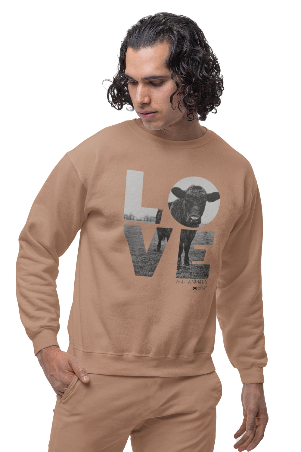 The ‘Love’ crewneck sweatshirt showcases a captivating design that seamlessly merges fashion with advocacy. The slogan ‘Love All Animals,’ paired with a striking image of a cow nestled within the letter ‘o,’ encourages a deep connection with and kindness toward all creatures. By wearing this sweatshirt, you not only make a bold style statement but inspire others to consider how their actions impact farmed animals.