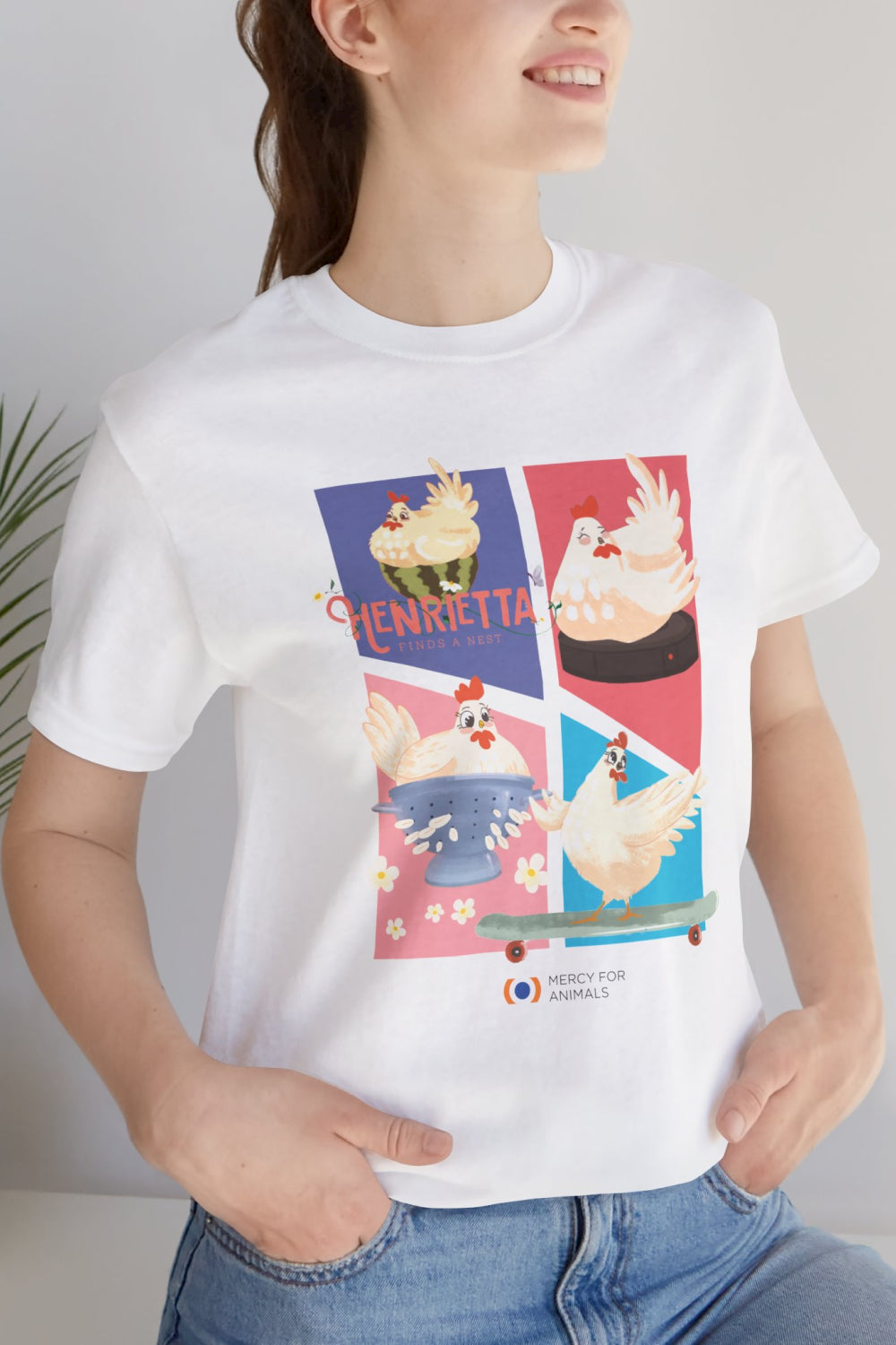 Introducing the Henrietta T-shirt, inspired by the beloved character from our animated short film, Henrietta Finds a Nest. This heartwarming tale follows Henrietta, a young chick who bravely escapes a factory farm and embarks on a journey to find friendship with a compassionate little girl. Based on real-life events, the story celebrates the individuality of farmed animals and promotes compassion and kindness. By sharing Henrietta’s story, you can highlight the uniqueness of every farmed animal and the wonderful lives they can have when given the opportunity.