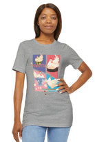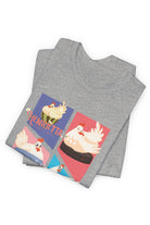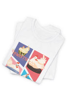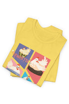 This tee features colorful panels depicting Henrietta in various joyous scenarios symbolizing freedom and friendship—from riding a Roomba to learning how to skateboard. The playful illustrations are set against a backdrop of soft pastels, bringing a sense of whimsy to the design. Crafted from high-quality materials, this T-shirt ensures comfort and style, making it a delightful addition to any wardrobe.